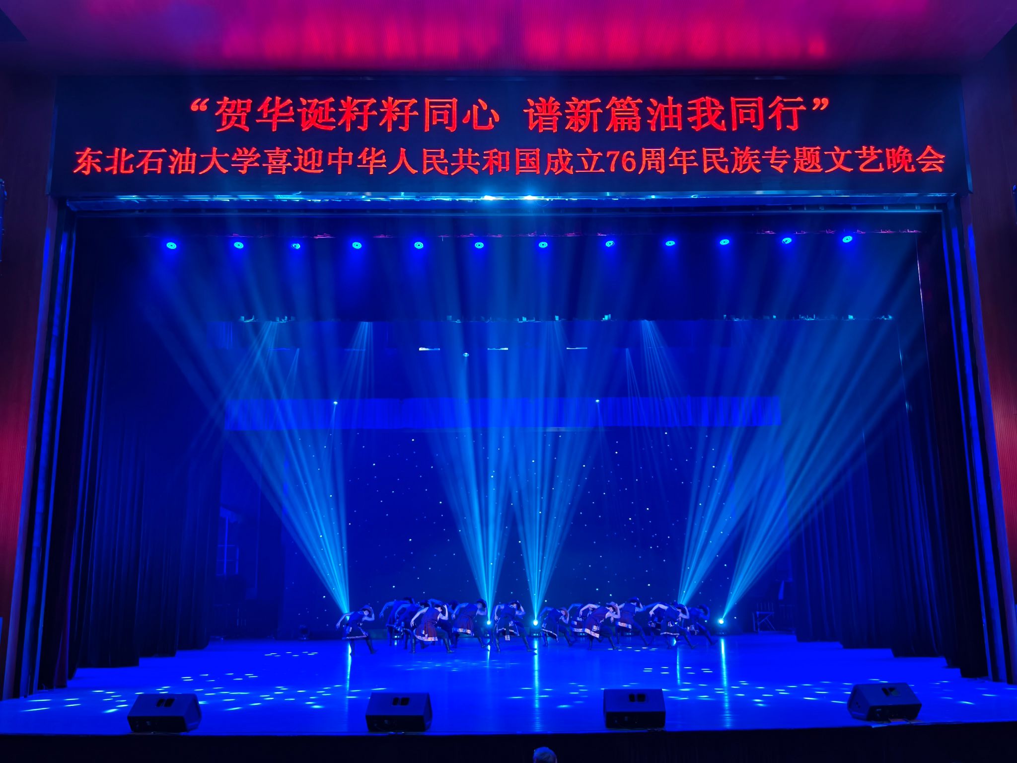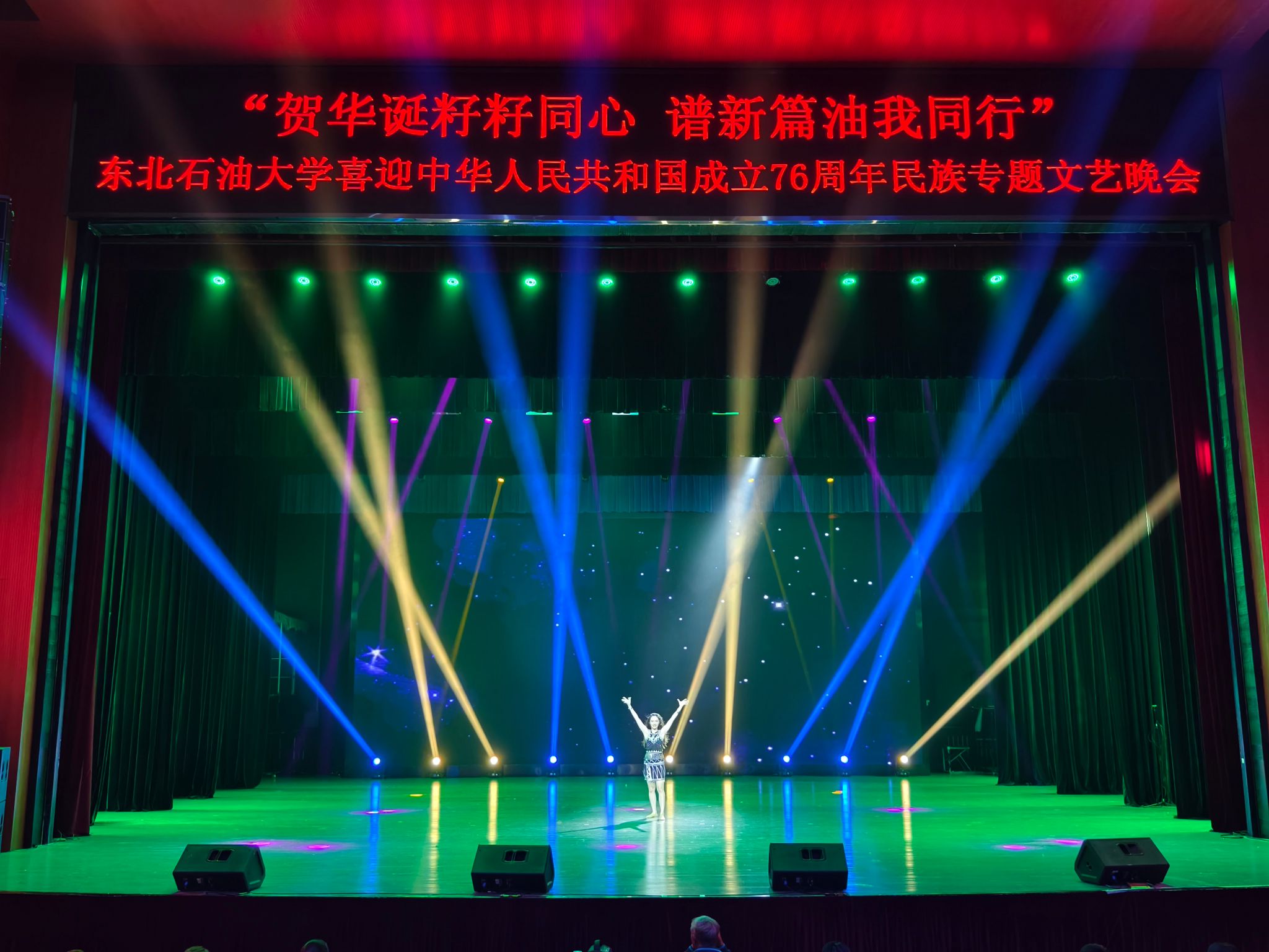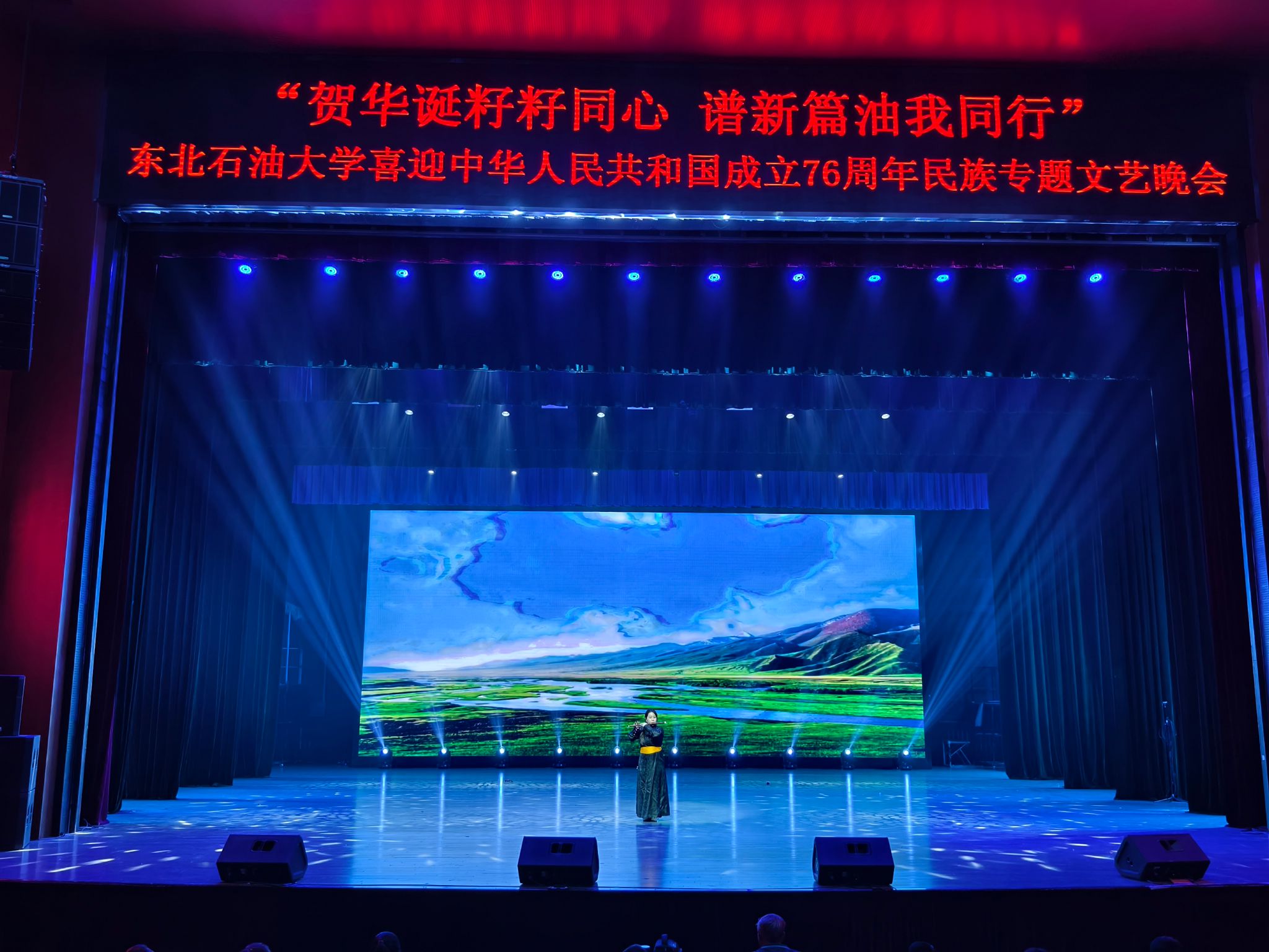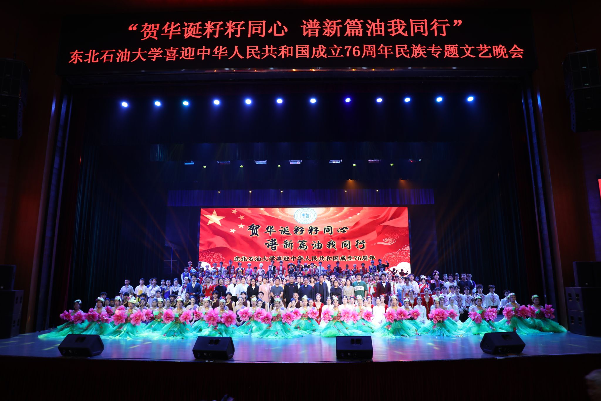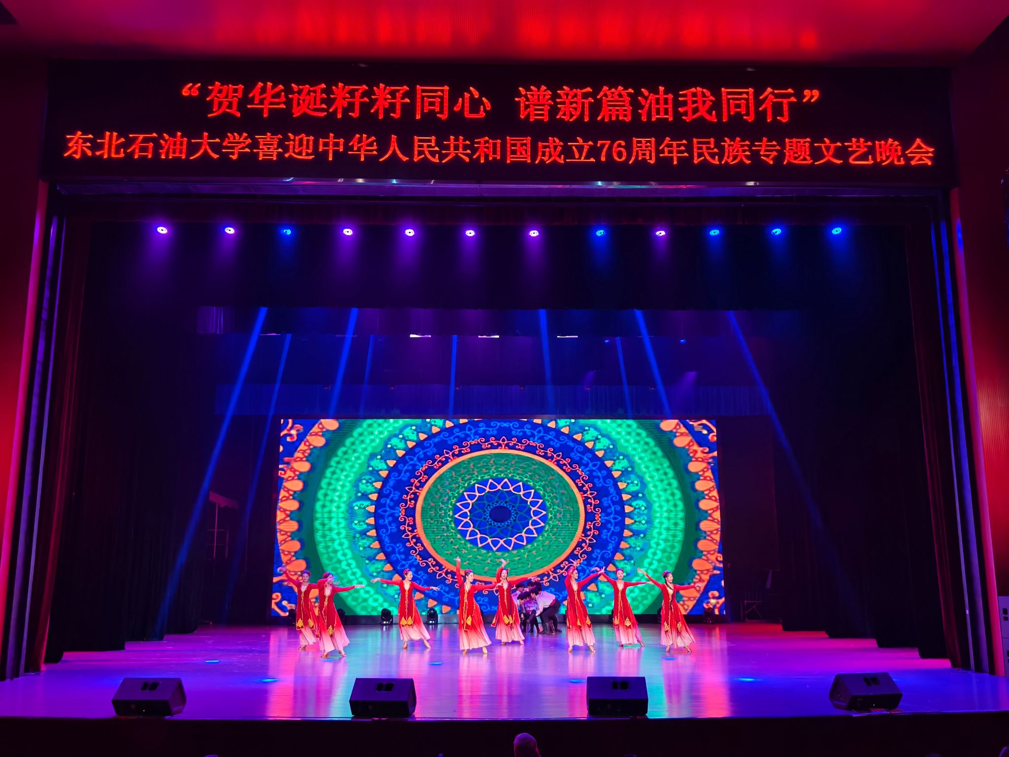 (通讯员 王书婷 记者/摄影 杨雨剑)为庆祝中华人民共和国成立76周年,深化民族团结进步教育,丰富“民族团结进步宣传月”活动内涵,9月27日晚,我校以“贺华诞籽籽同心 谱新篇油我同行”为主题,在音乐厅举办喜迎中华人民共和国成立76周年民族专题文艺晚会。校长董宏丽,校党委常委、组织部部长张智勇,校党委常委、宣传部部长徐清亮出席,校机关及二级学院相关负责人参加。本次晚会由党委统战部主办、大学生艺术团团总支承办、艺术学院协办,全校师生代表欢聚一堂,共赏民族文化盛宴,共话民族团结深情。