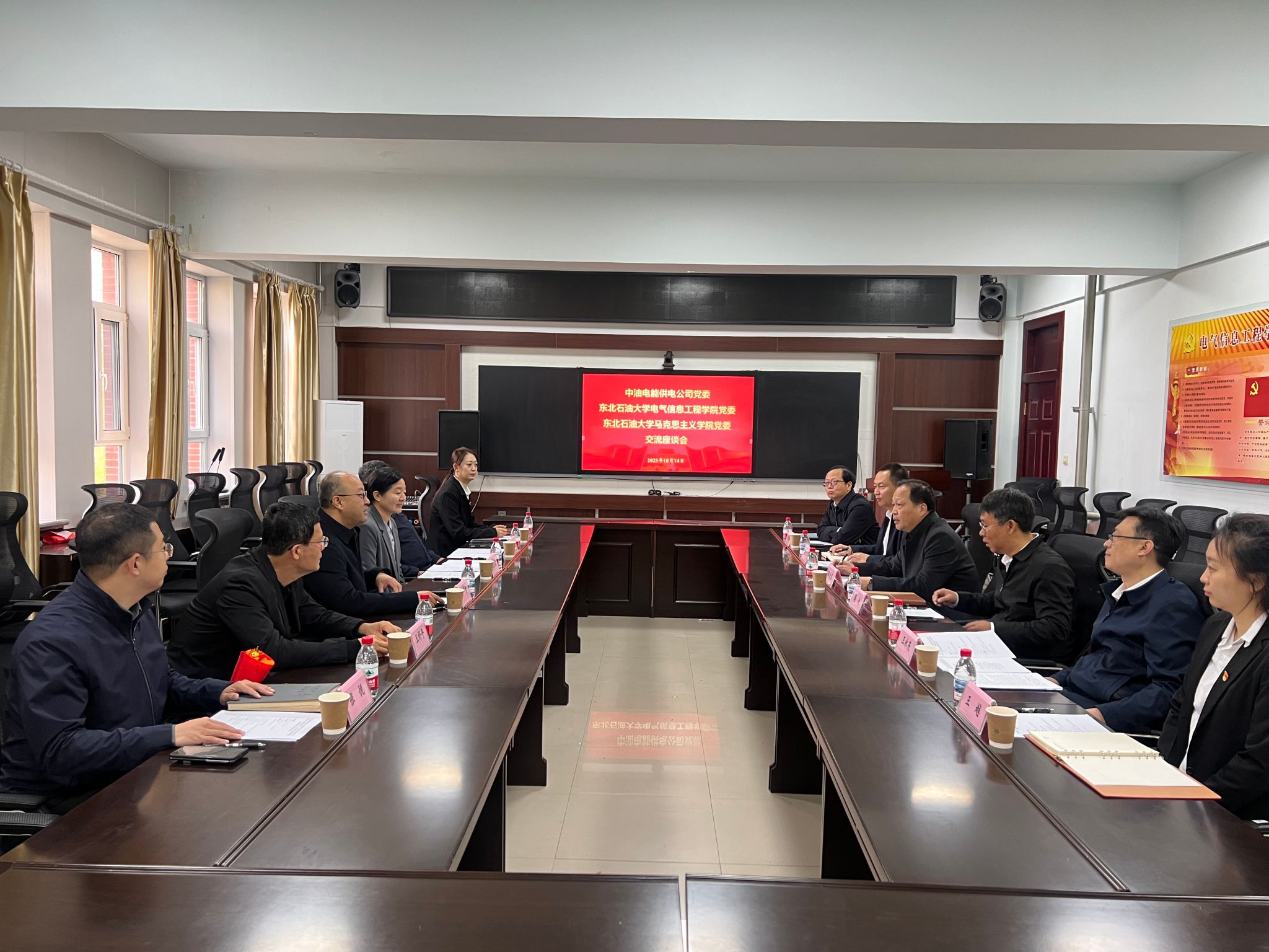 (图/文 戴语涵 记者 杨雨剑)为深入贯彻落实新时代党的建设总要求,充分发挥校企党建引领作用,推动党建工作与业务发展深度融合,10月14日,电气信息工程学院党委、马克思主义学院党委与中油电能供电公司党委在电气信息工程学院自动化馆317会议室召开党建共建交流座谈会。中油电能供电公司党委书记李可君、党委副书记浦秀双、一级工程师王舒平、人力资源部主任尤广庆、人力资源部培训管理员张悦、星火一次变电所党支部副书记张玉莹以及电气信息工程学院党委、马克思主义学院党委班子成员出席。会议由电气信息工程学院党委书记周全主持。
