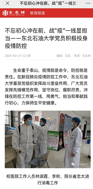 2月14日,东北网以《不忘初心冲在前,战“疫”一线显担当——东北石油大学党员积极投身疫情防控》为题,报道了我校党员积极投身新型冠状病毒感染肺炎疫情防控工作情况。